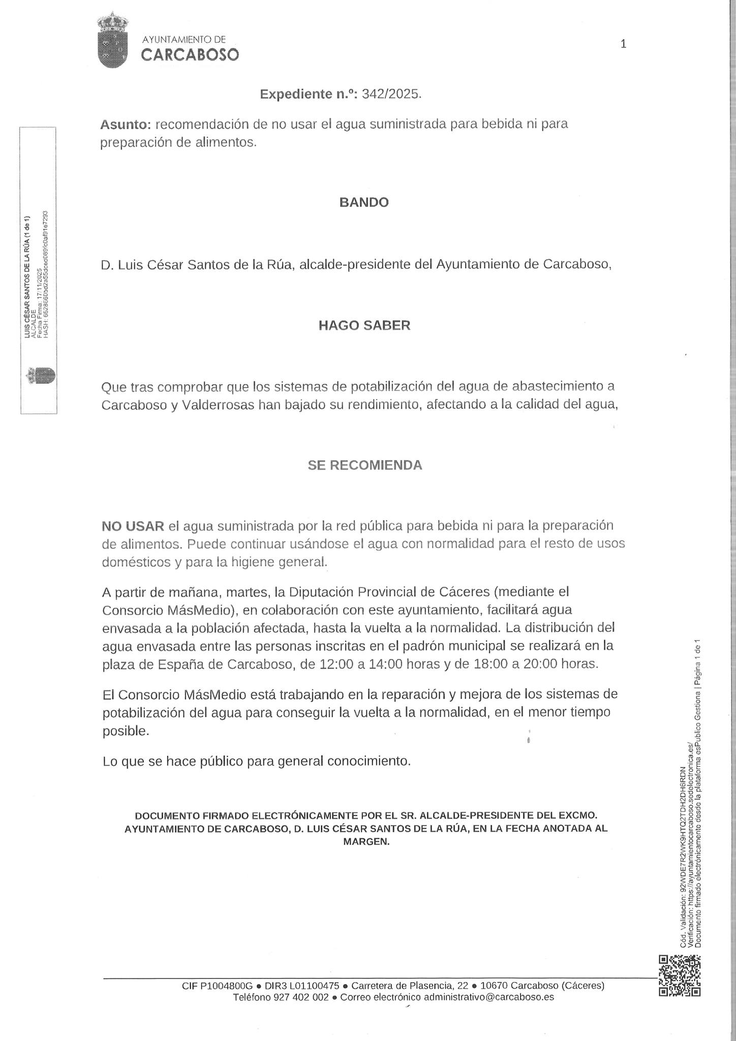 Se adjunta bando en el que se especifica las recomendaciones para el uso de agua potable y las medidas correctoras a seguir.